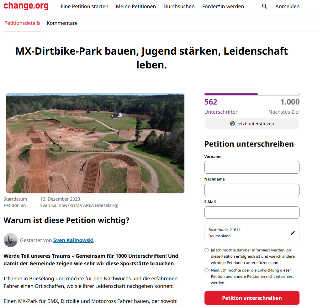 Lasst uns gemeinsam dafür sorgen, dass Brieselang einen Platz bekommt, an dem Kinder die Freiheit auf zwei Rädern erleben dürfen. Unterzeichnet unsere Petition, gebt eure Stimme für eine Idee, die das Havelland bereichern wird, und zeigt, dass wir zusammen mehr erreichen können. Hier geht es nicht nur um Motocross – hier geht es um die Freiheit, Träume zu leben.