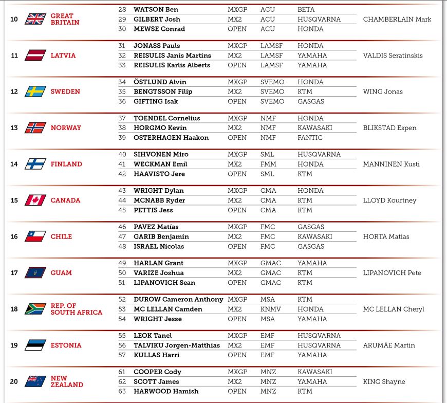 Es gibt in diesem Jahr noch andere starke Konkurrenten wie Jago Geerts, Liam Everts und Lucas Coenen vom belgischen Team, die dieses Jahr das jüngste Team sind, Team Deutschland mit Ken Roczen, Simon Laengenfelder und Tom Koch, Team Italien mit Alberto Forato, Andrea Adamo und Mattia Guadagnini, Team Spanien mit Jorge Prado, Ruben Fernandez und David Braceras und Team Niederlande mit Glenn Coldenhoff, Kay de Wolf und Calvin Vlaanderen, die um die Spitzenplätze kämpfen werden.